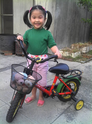 晚上睡覺被蚊子襲擊,左眼上腫了個大包的甄妹,一見心愛的腳踏車,便忘了癢,直拉著馬麻帶她到